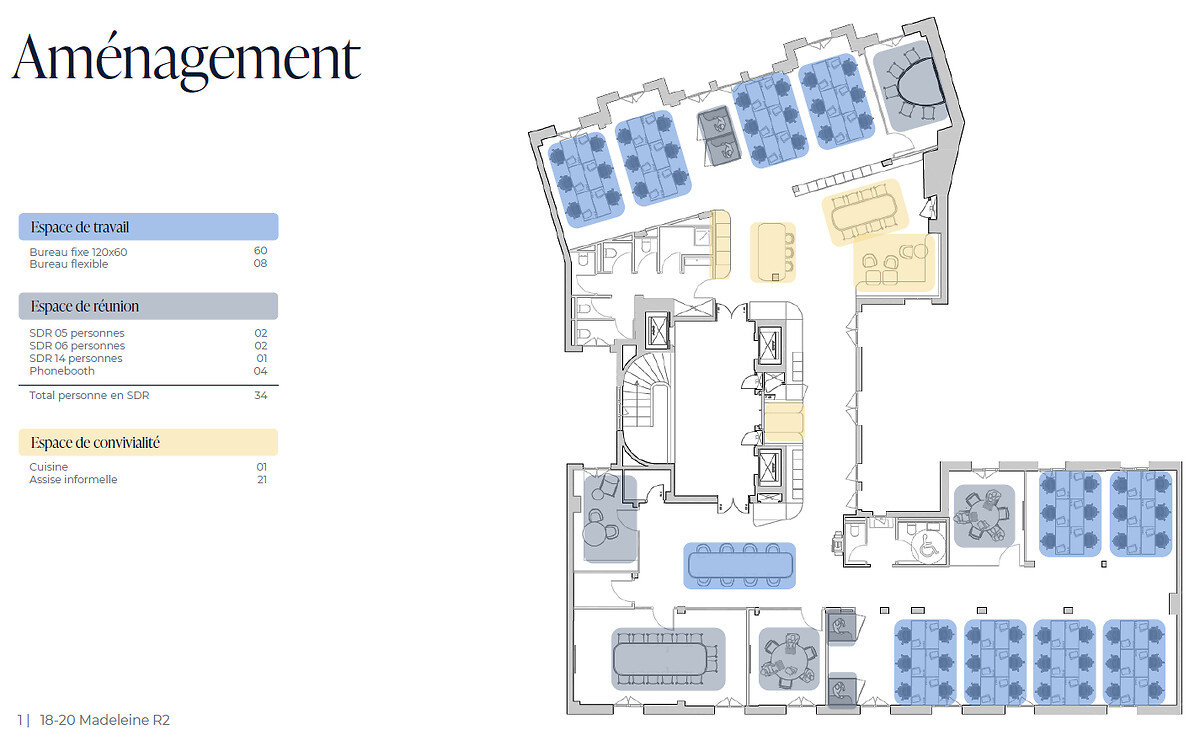 A 140 sq.m. space is located on the 1st floor, on the Rue Vignon side.