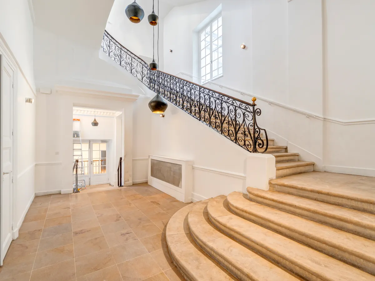 A Haussmann-style private mansion of a high standard. A large room with parquet flooring and mouldings, a listed staircase.