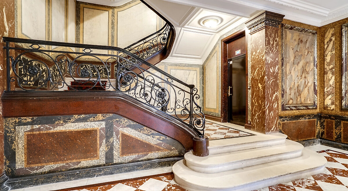 Très belles parties communes avec escalier intérieur majestueux. Avec de très belles prestations haussmanniennes : parquet, moulures et cheminées.