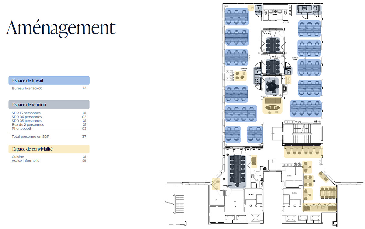 Traversants et baignés de lumière naturelle, ils offrent des environnements de travail modulables, ouverts sur les cours intérieures. Conçus pour le flex office, ils intègrent salles de réunion, espaces collaboratifs et zones informelles pour favoriser l’efficacité et les échanges.
