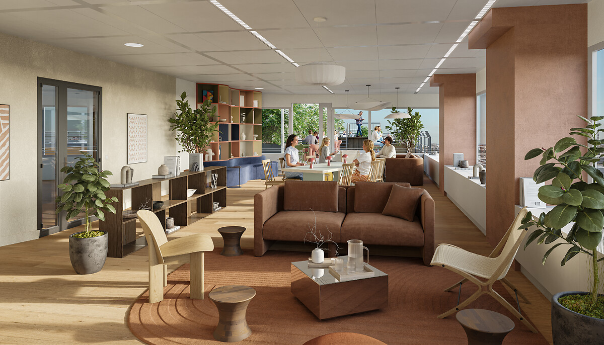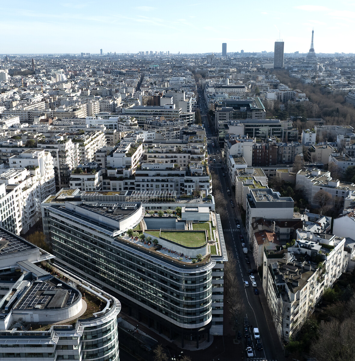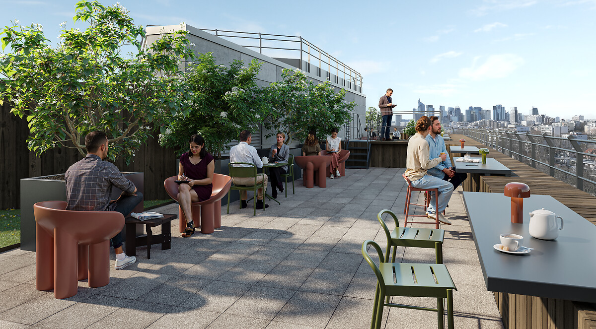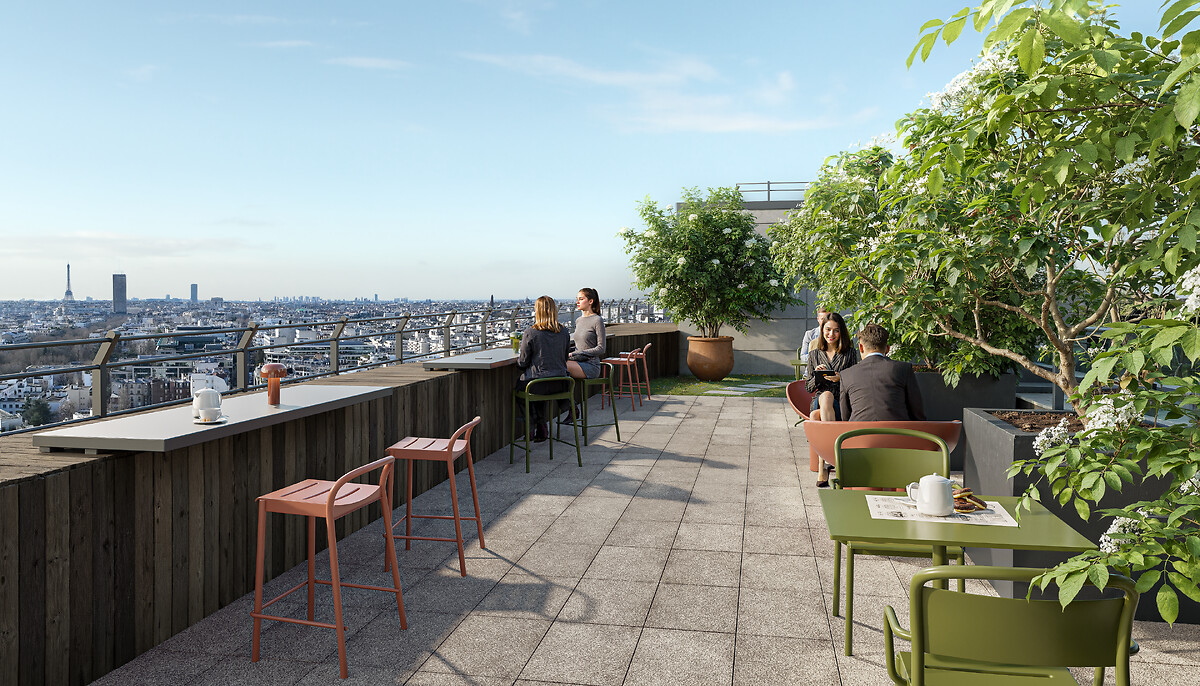 Rooftop de 160 m² au R+10 avec une vue dégagée sur l’île de la Jatte, La Défense et la Tour Eiffel. Savourez un moment de calme au cœur d’un coin de verdure. Idéal pour prendre un café, échanger, travailler en hauteur.