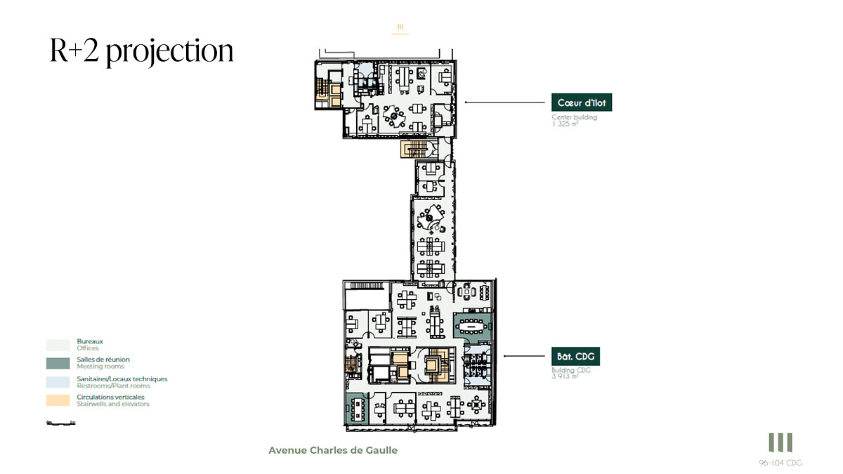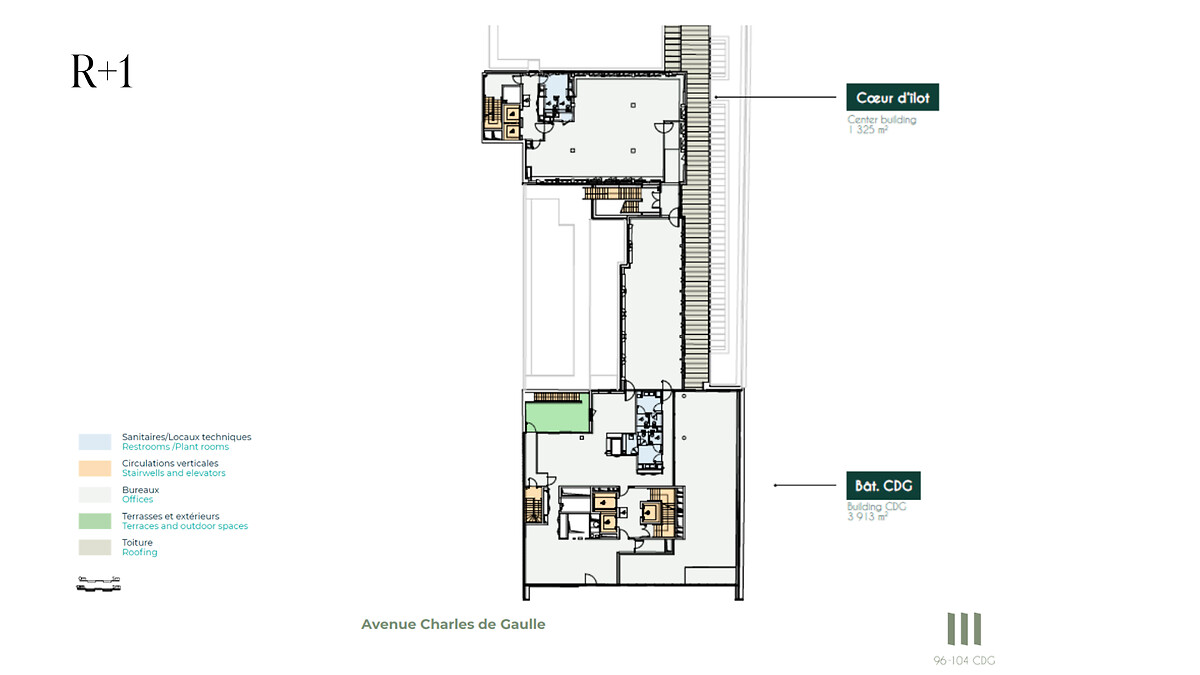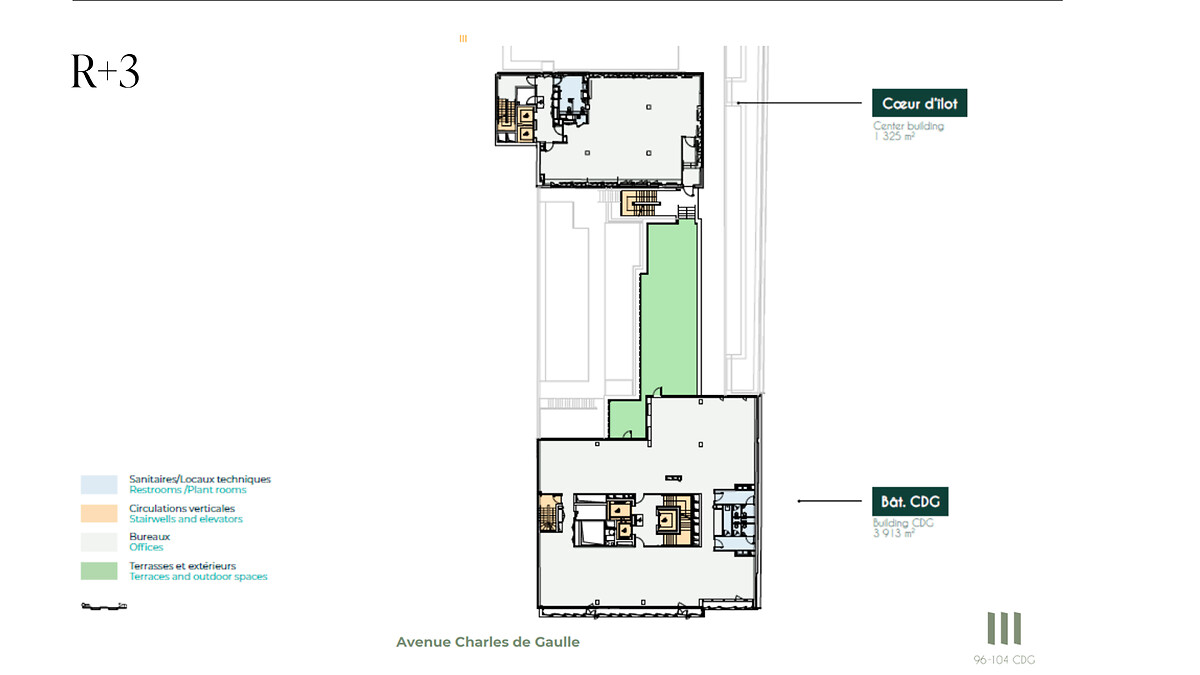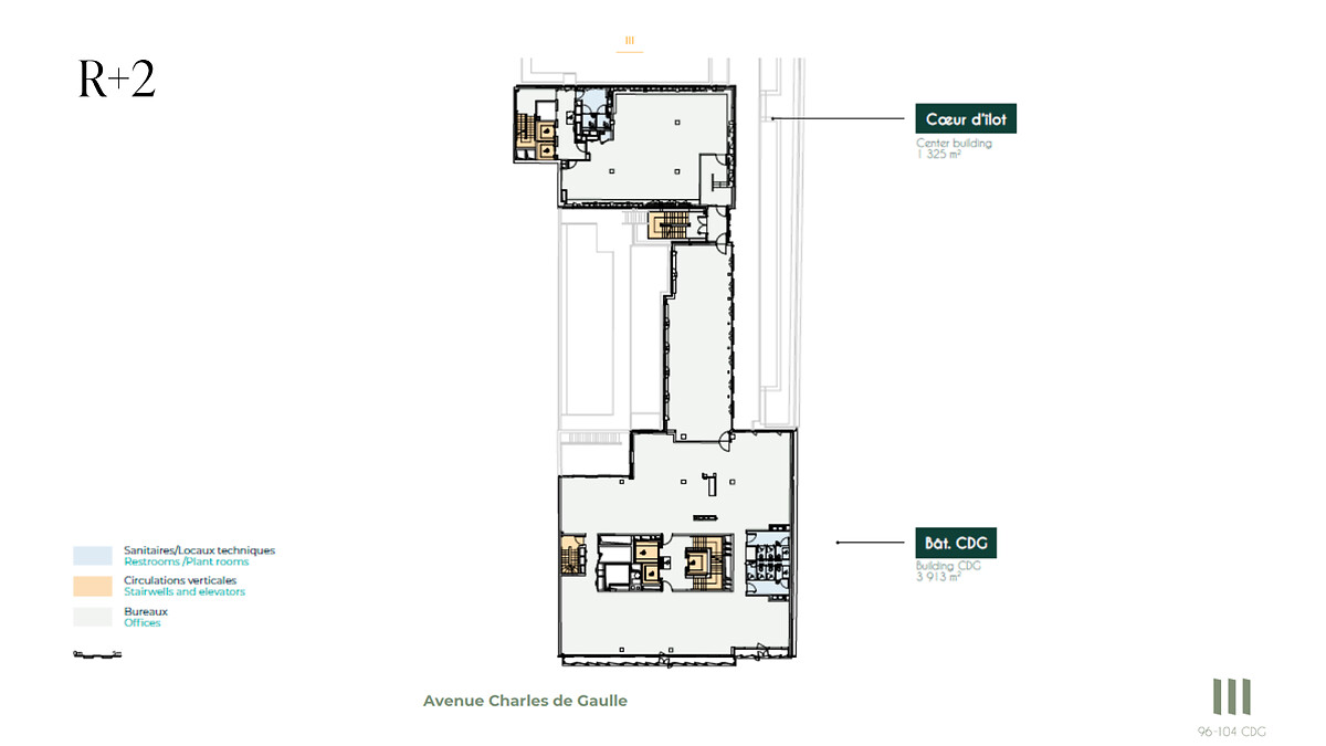 Situé sur l'axe Paris – Neuilly – La Défense, le 96/104 Charles de Gaulle est un ensemble immobilier composé de trois bâtiments, à l'architecture revisitée par le cabinet Lobjoy & Bouvier. Le 96/104 CDG offre 10 520 m² de bureaux avec des plateaux de bureaux flexibles de 330 m² en moyenne. Au cœur d'un quartier en pleine mutation, cet immeuble bénéficie d'un cadre exceptionnel mêlant prestige, dynamisme et l'ambition de Neuilly-sur-Seine, avec ses nouvelles allées arborées, facilitant les mobilités douces.