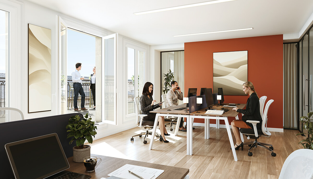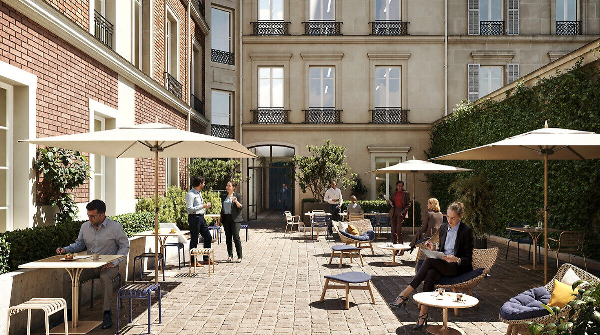 L’immeuble offre 290 m² d’espaces extérieurs privatifs, dont une cour intérieure de 250 m² et une grande terrasse de 30 m² au 5ᵉ étage. Un lieu pensé pour travailler autrement, organiser des événements internes ou simplement profiter de moments de détente.