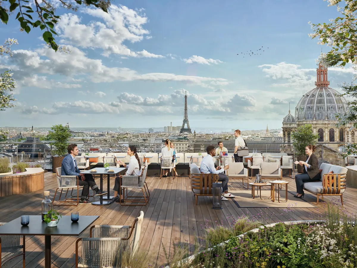 Terrasses et Rooftop avec vues 360° sur les plus grands monuments de Paris : la tour Eiffel, le Grand Palais, Montmartre, Saint-Augustin, ou encore La Défense.