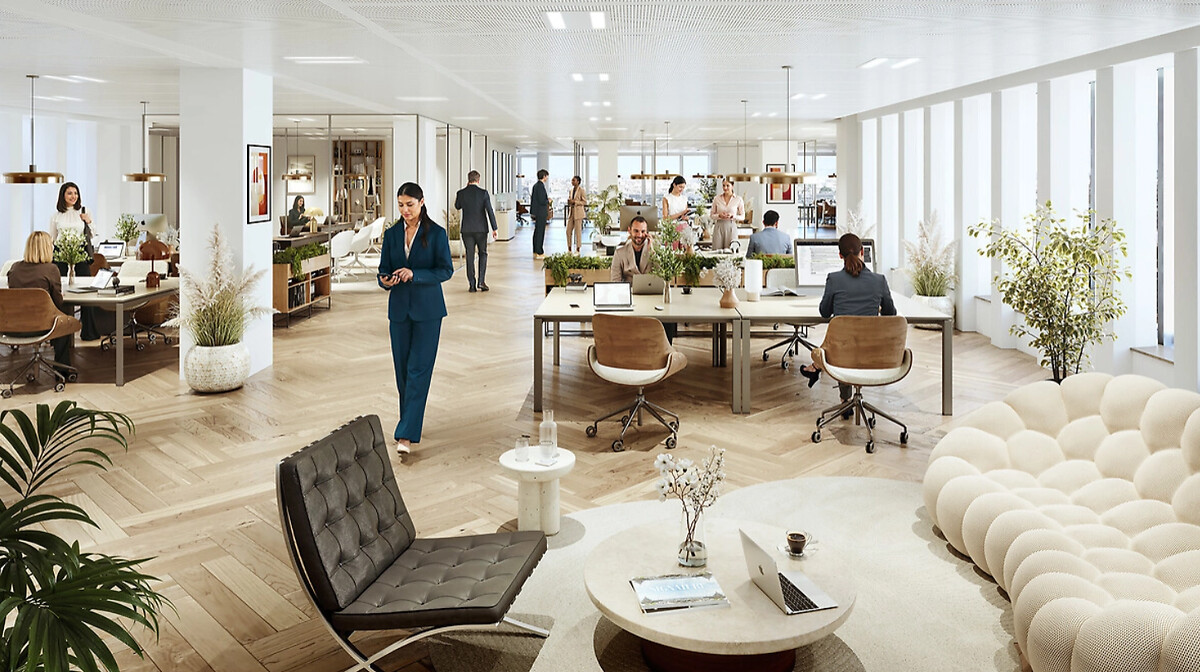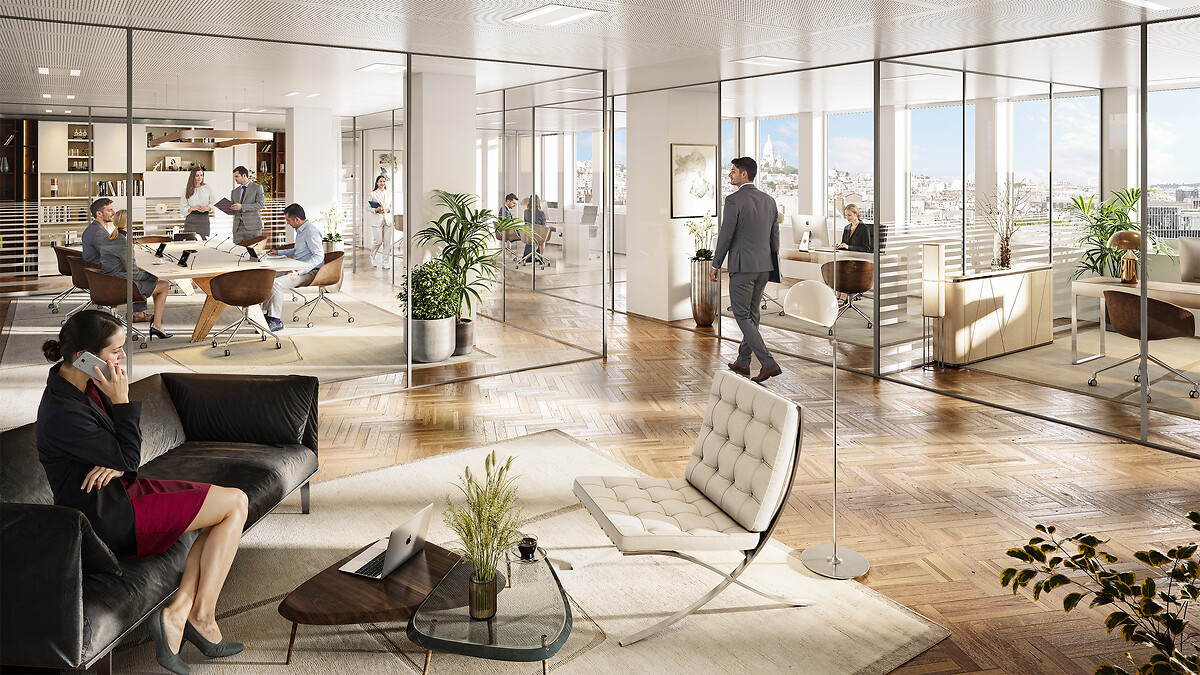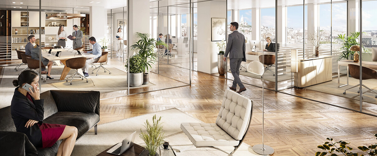 Les vastes plateaux — jusqu’à 3 300 m² — se prolongent vers l’extérieur grâce à 2 500 m² d’espaces végétalisés : deux patios paysagers et un rooftop panoramique offrant une vue à 360° sur tout Paris. Leur modularité s’adapte à tous les types d’aménagement, open-space, mixte ou cloisonné.