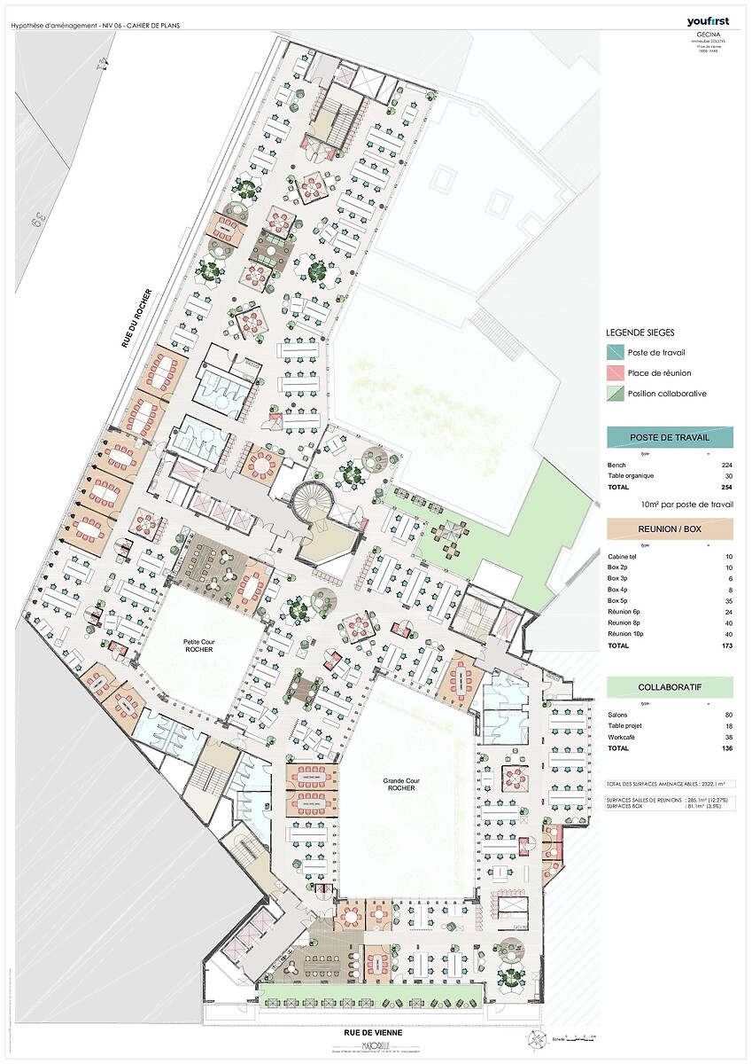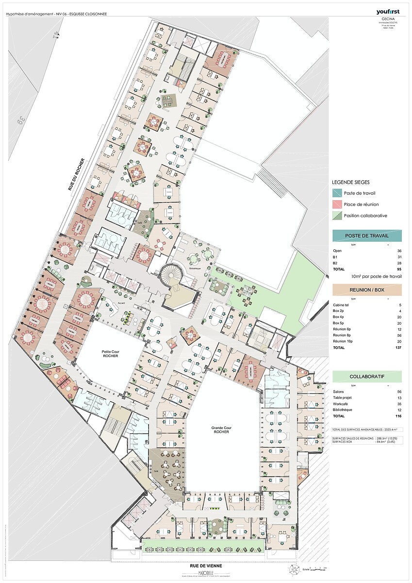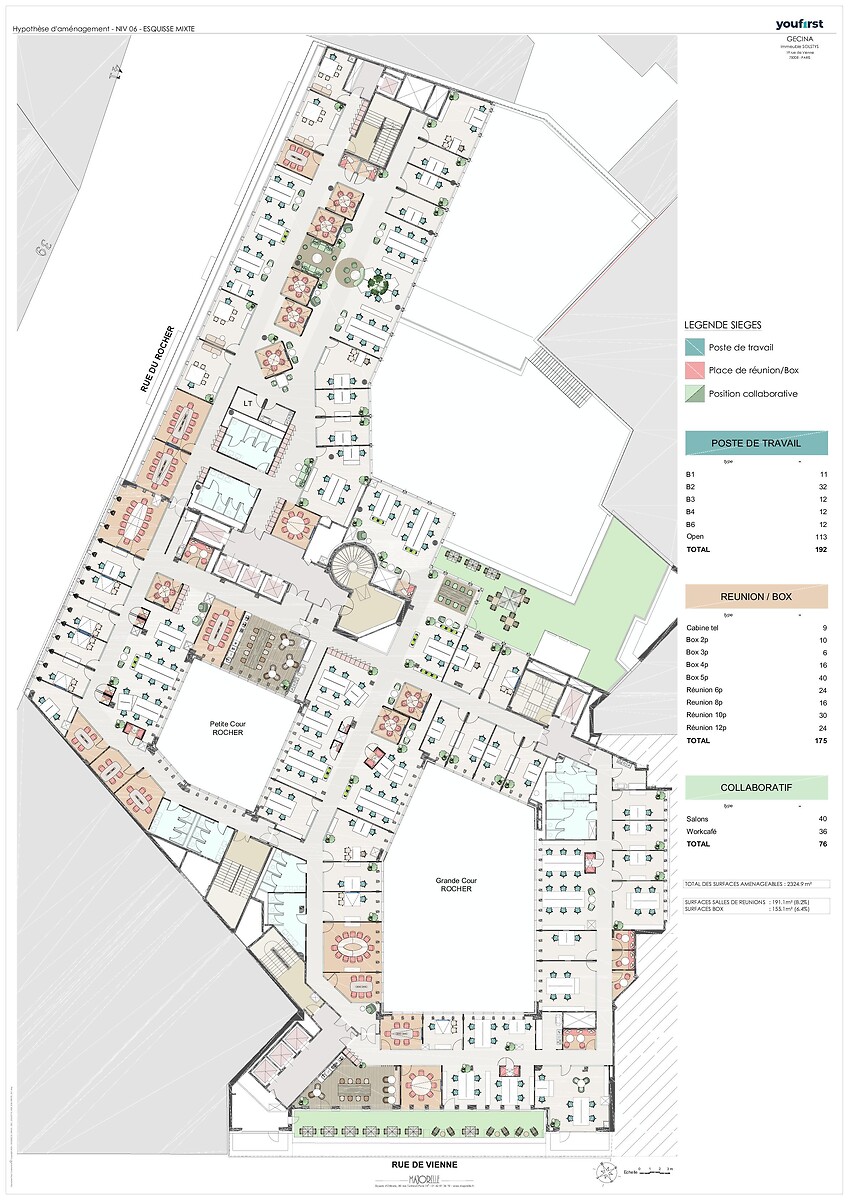 24 700 m² de bureaux répartis sur 8 étages, avec de vastes plateaux modulables jusqu’à 3 300 m². Possibilité d’extension pour 45 000m² avec l’Immeuble 7 Madrid et l’hotel particulier attenant.