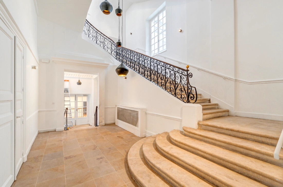 Un hôtel particulier haussmannien de haut standing. Une grande salle avec parquets et moulures, un escalier classé.